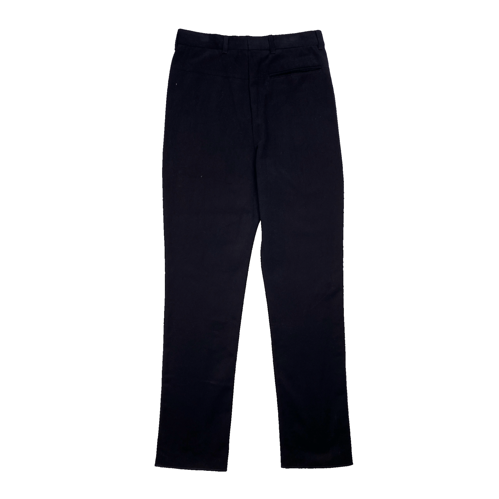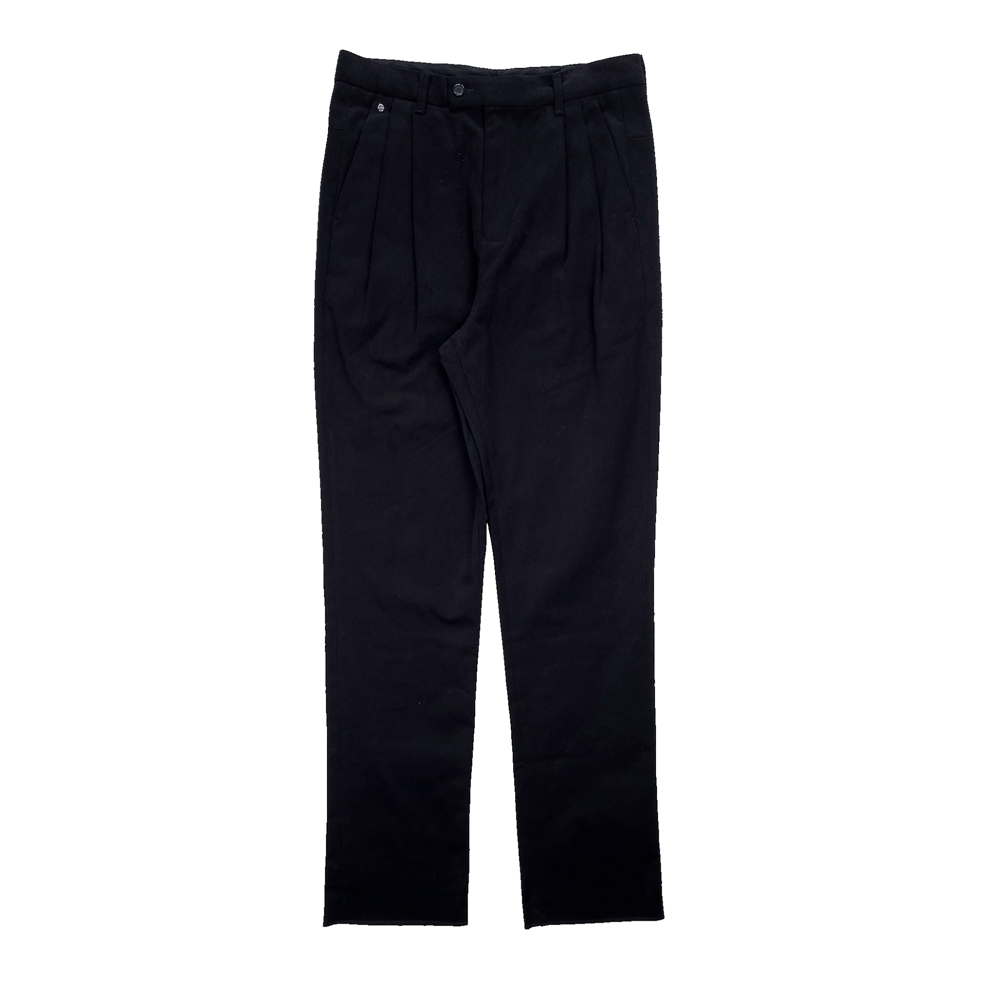 Classic triple pleated pants with long crotch and narrow leg. Features two side pockets and one buttoned back pocket.