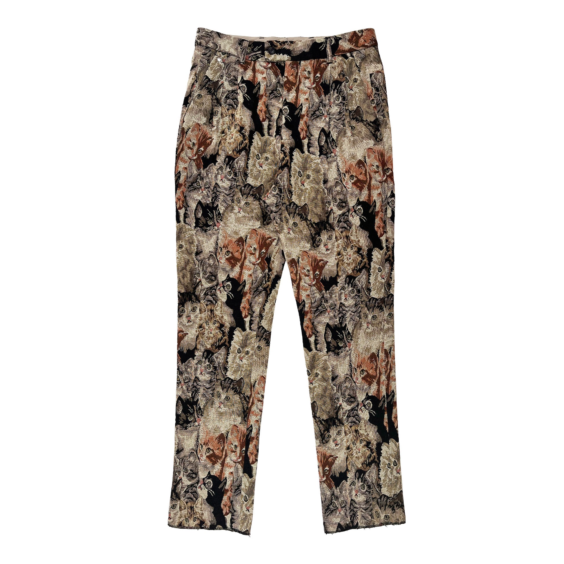 Classic triple pleated pants with long crotch and narrow leg. Features two side pockets and one buttoned back pocket.