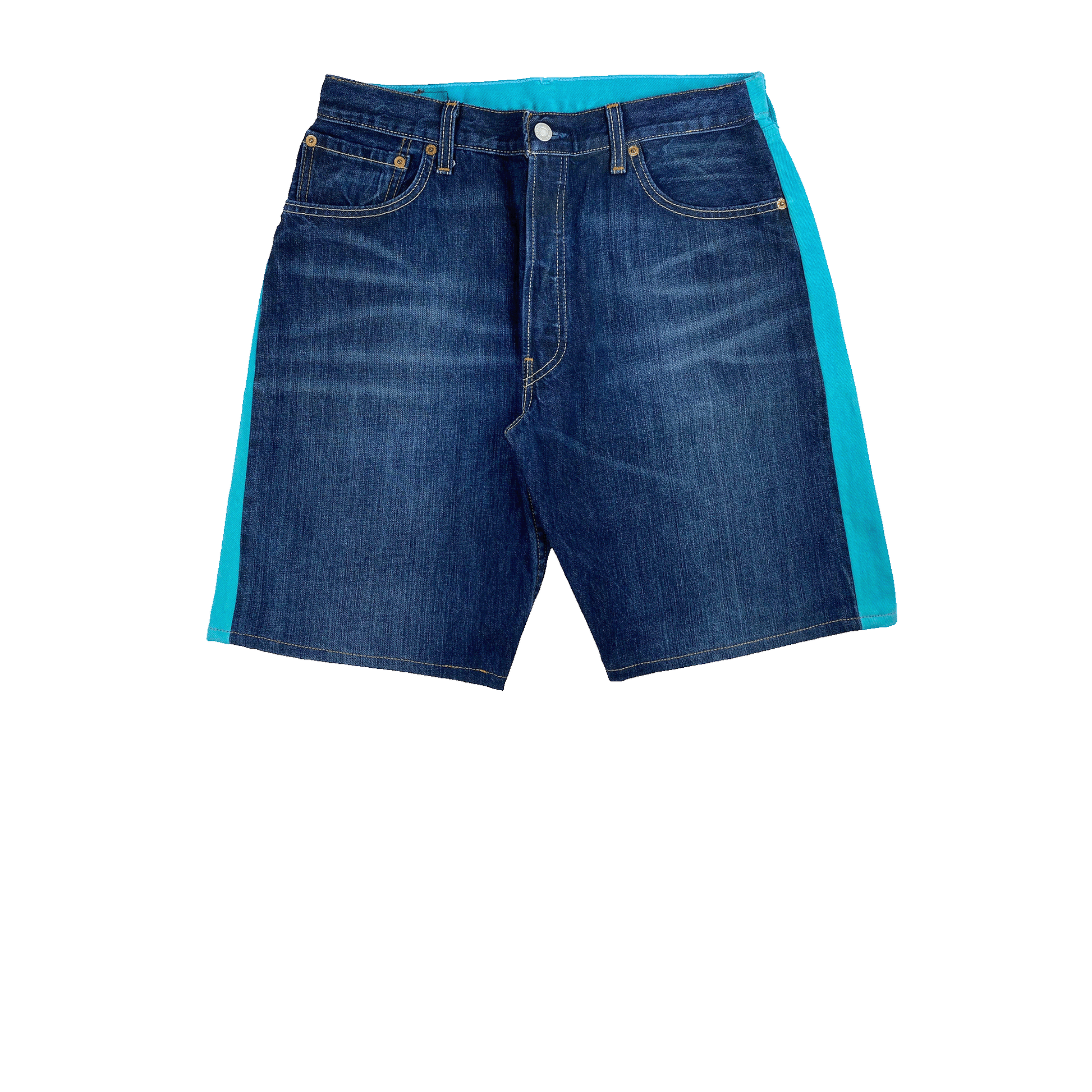 Jeanspleatfrontshorts are made of two different pairs of vintage Levis jeans sewn together. Front or back are color-dyed and the shape is unique for each pair.