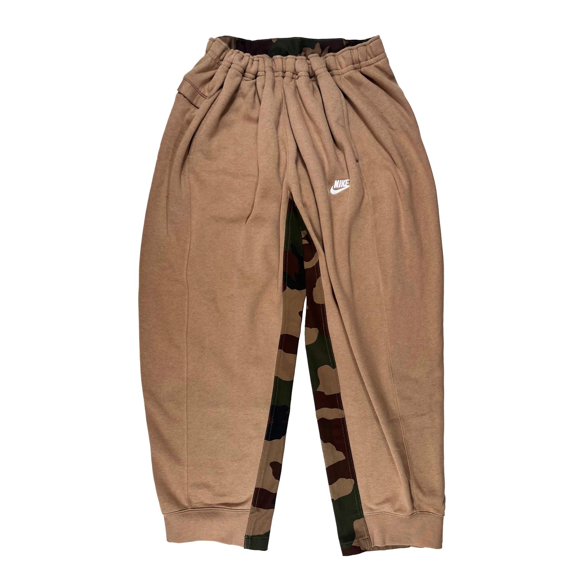 Nike sweatpants in the front sewn to camouflage pants in the back. Features elastic hems in front and pockets in the back.