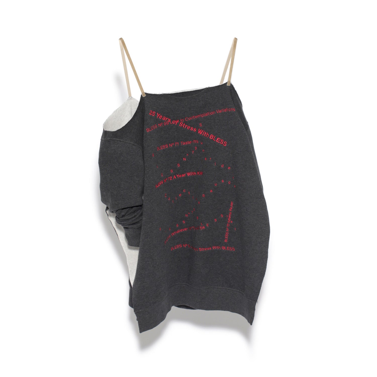Embroidered off-shoulder sweatshirt held up by two elastic straps with cut open sides and a kangaroo pocket.