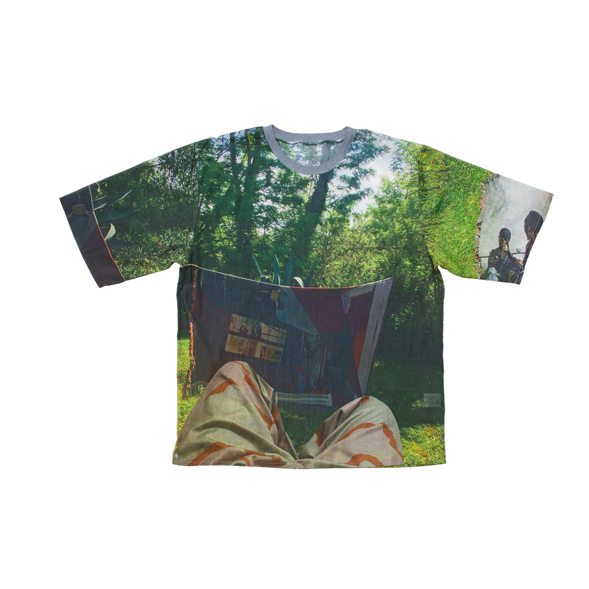 Lightweight sheer printed short sleeve t-shirt with continued image on rear.