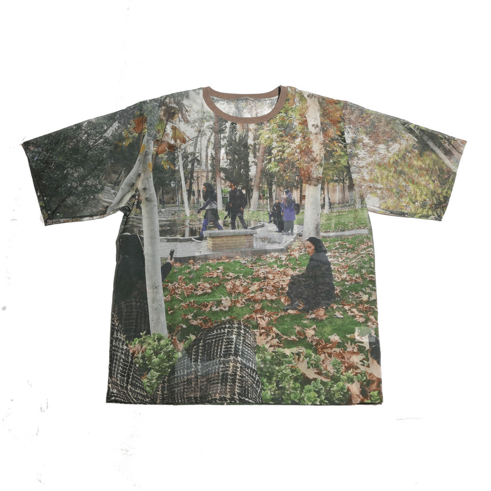 Lightweight sheer printed short sleeve t-shirt with continued image on rear.