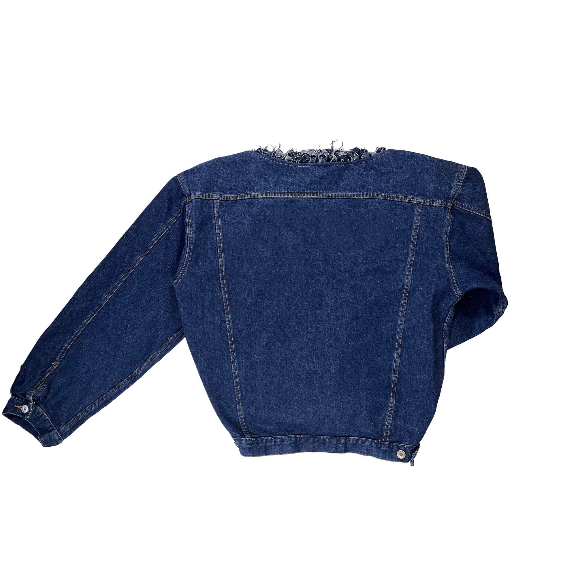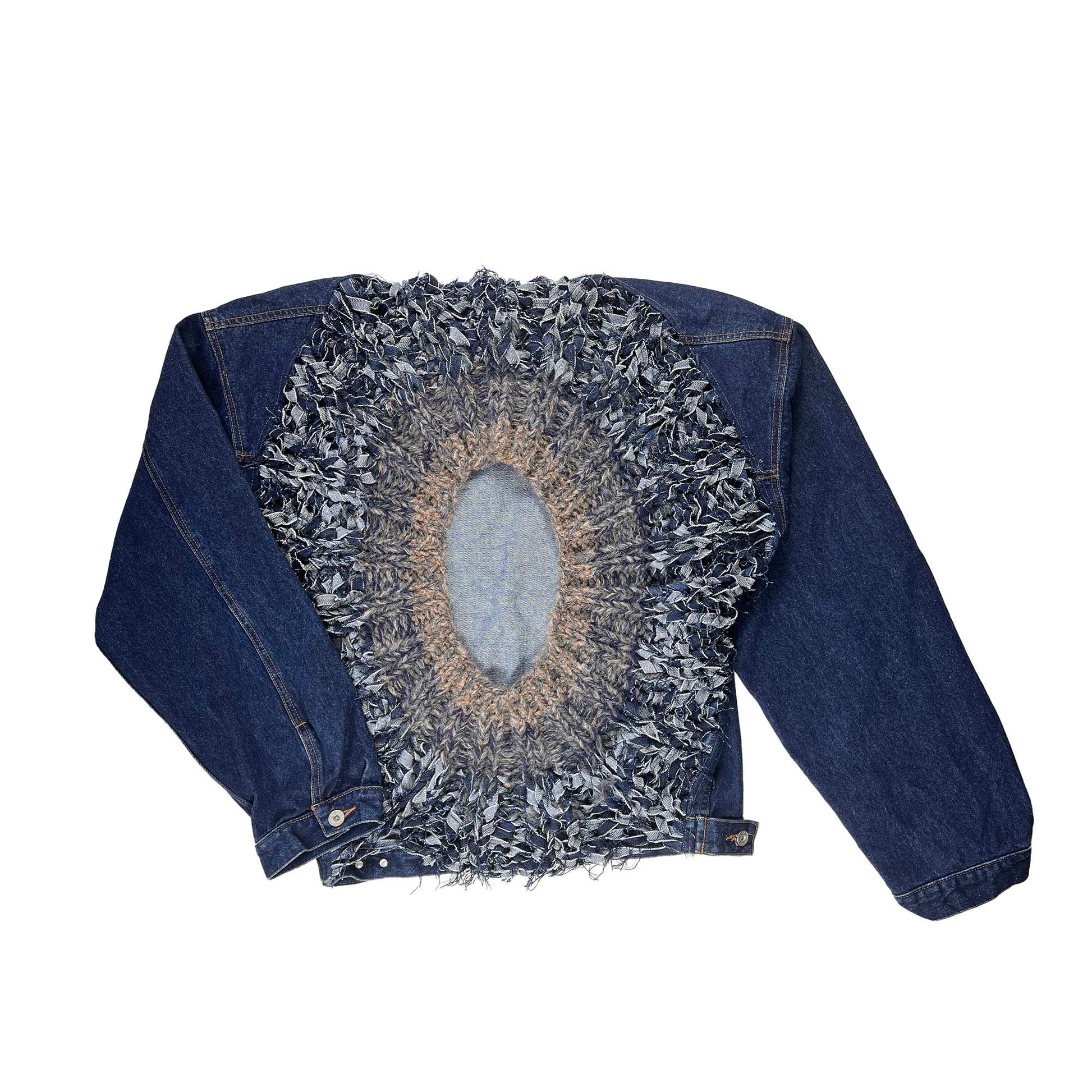 Deconstructed Vintage Denim jacket with open circle-knit in front. Hand-knitted from wool and denim. Buttoned cuffs on sleeves. The fit is oversized.