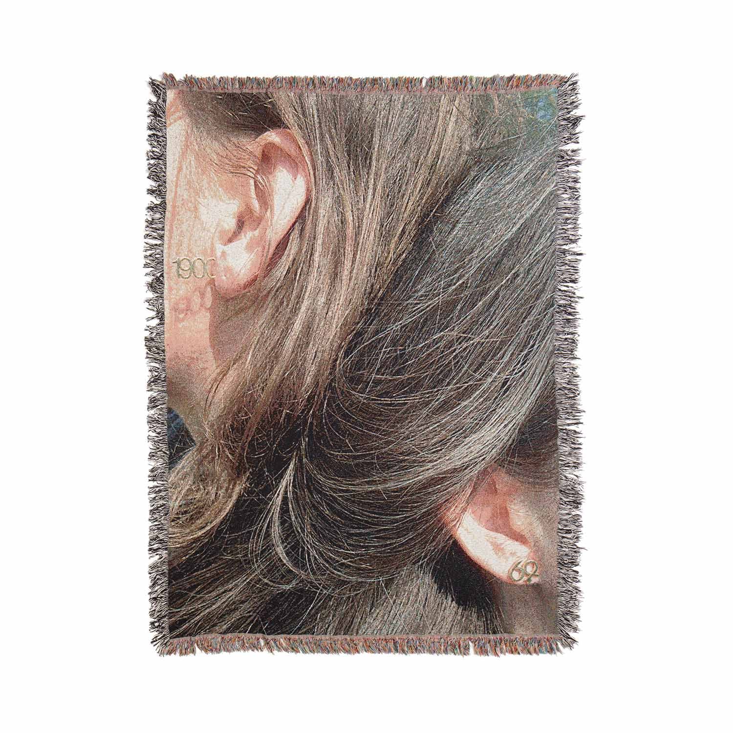 Woven blanket with fringed edge and BLESS engraved logo button.