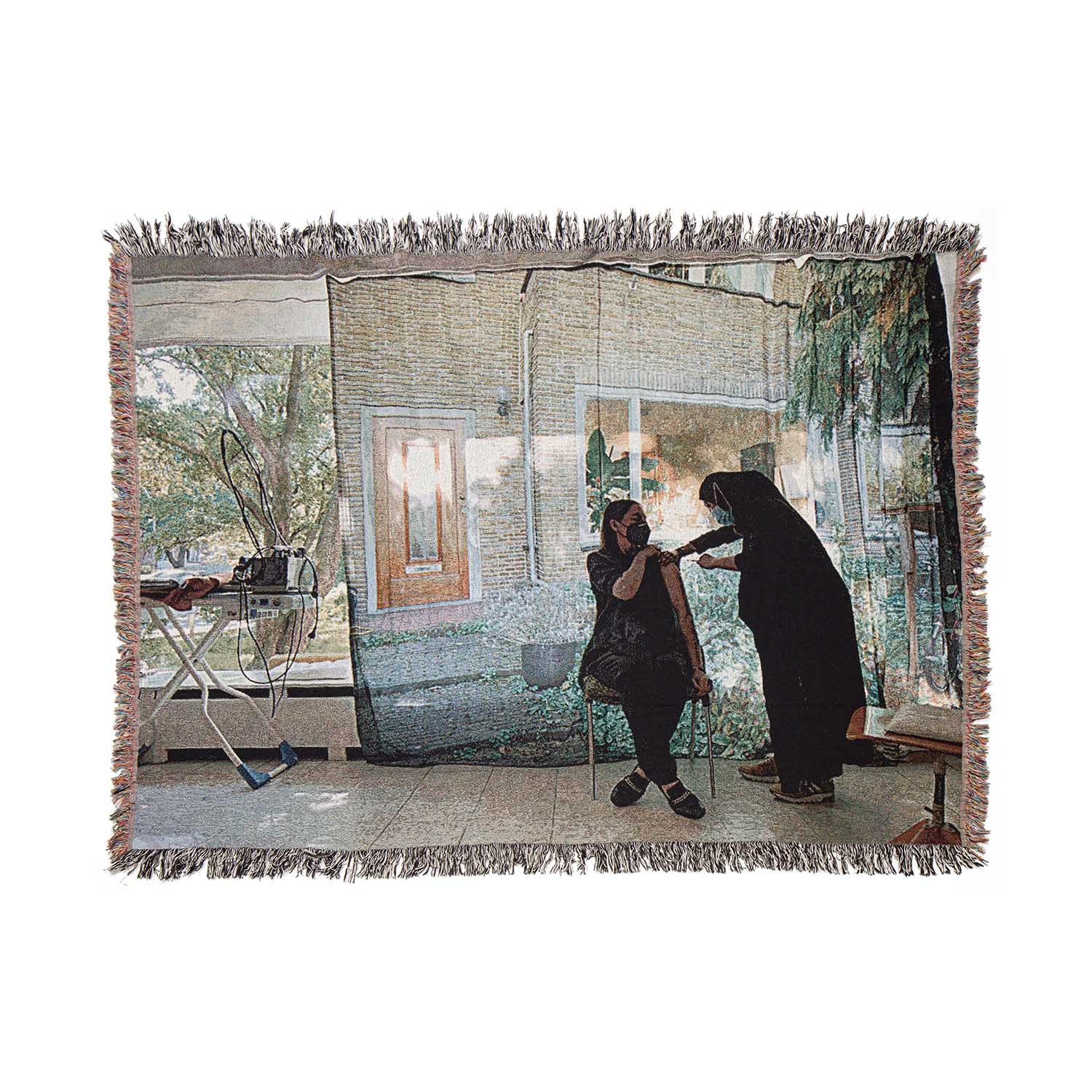 Woven blanket with fringed edge and BLESS engraved logo button.