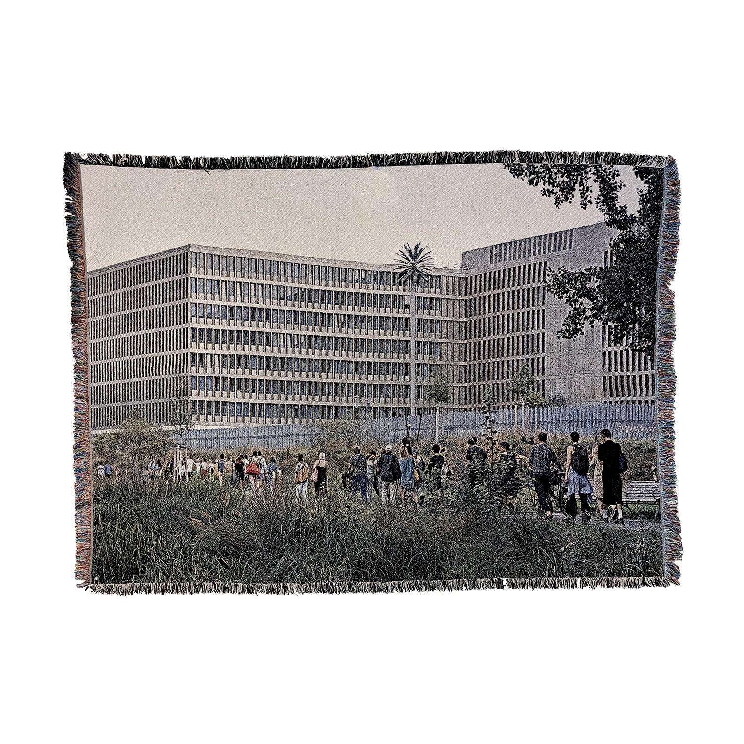 Woven blanket with fringed edge and BLESS engraved logo button.