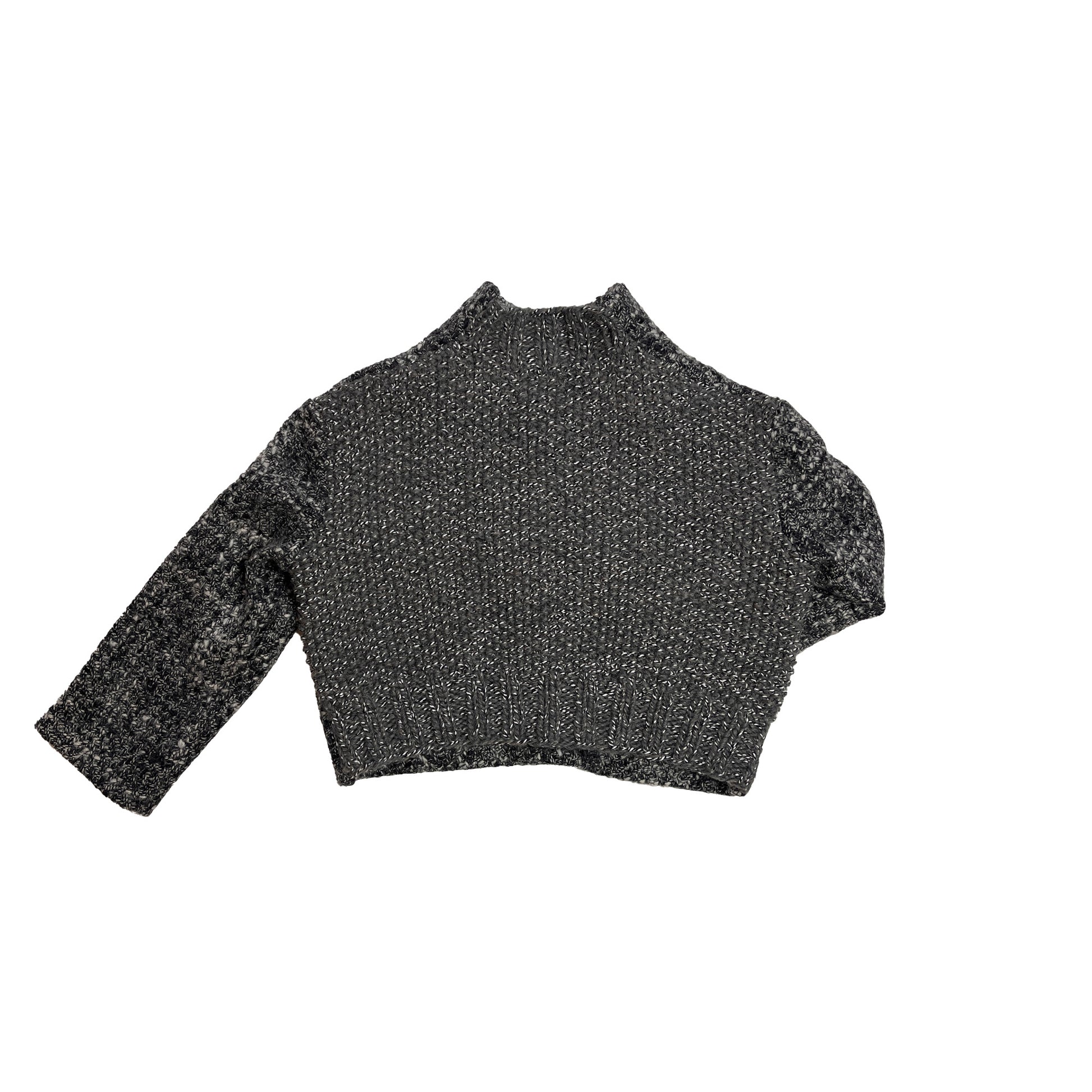 Short jacket with hand knitted backside. Outer material is grey woven wool, lined in viscose. Oversized fit.