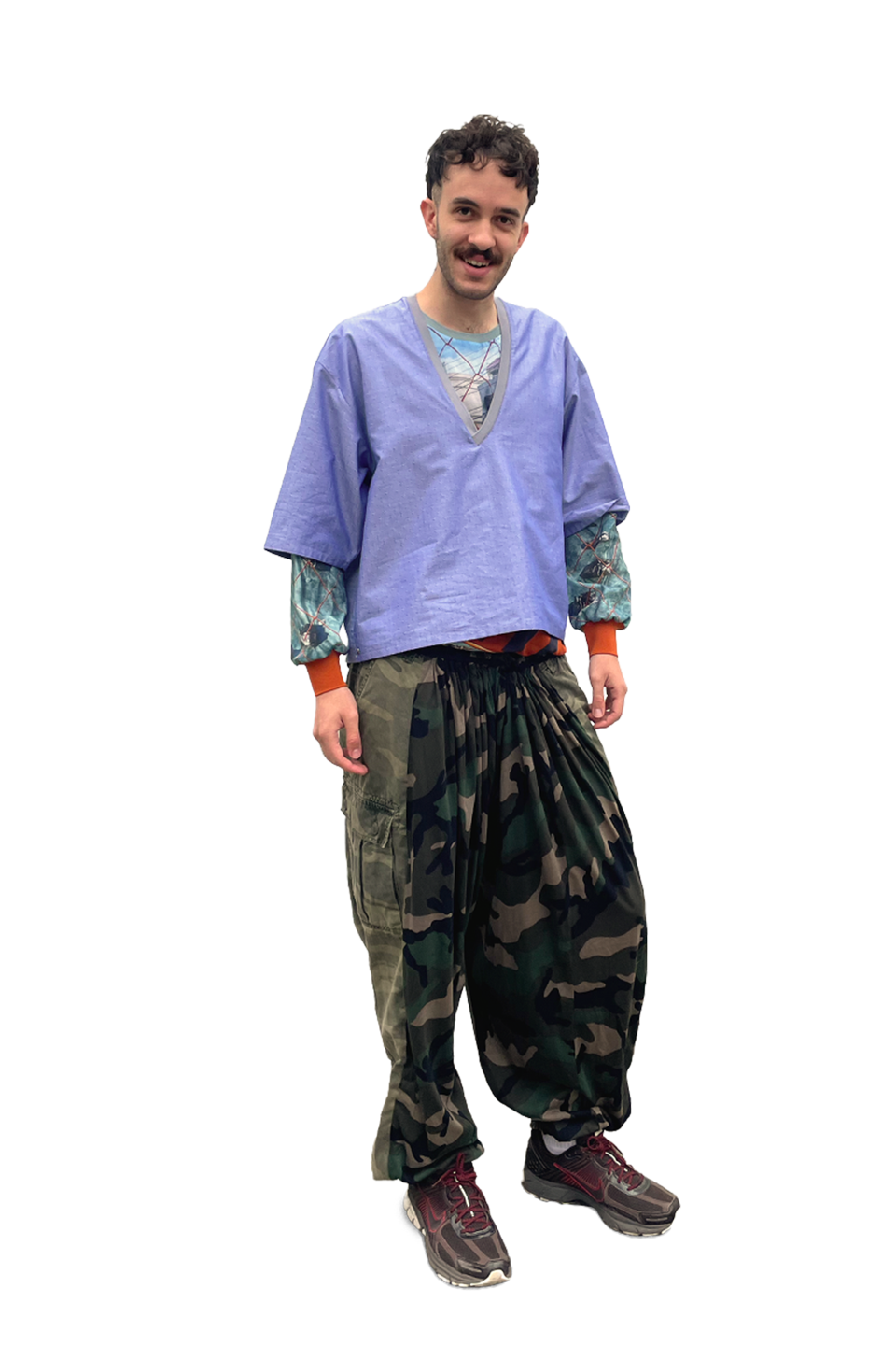 Short-sleeve deep v-neck top with elastic straps inside that can be wrapped around the torso to hold the shirt in place or worn loosely hanging down.