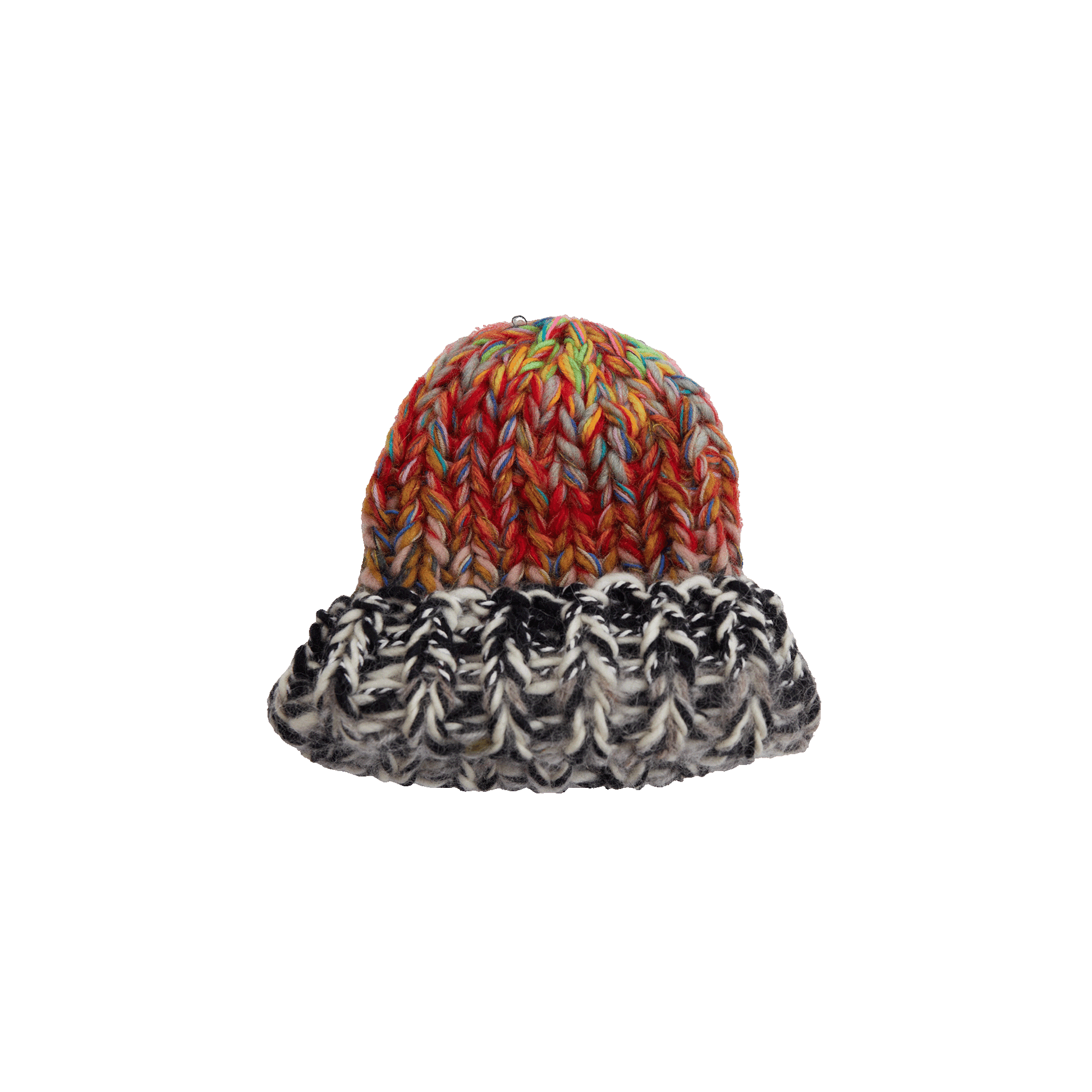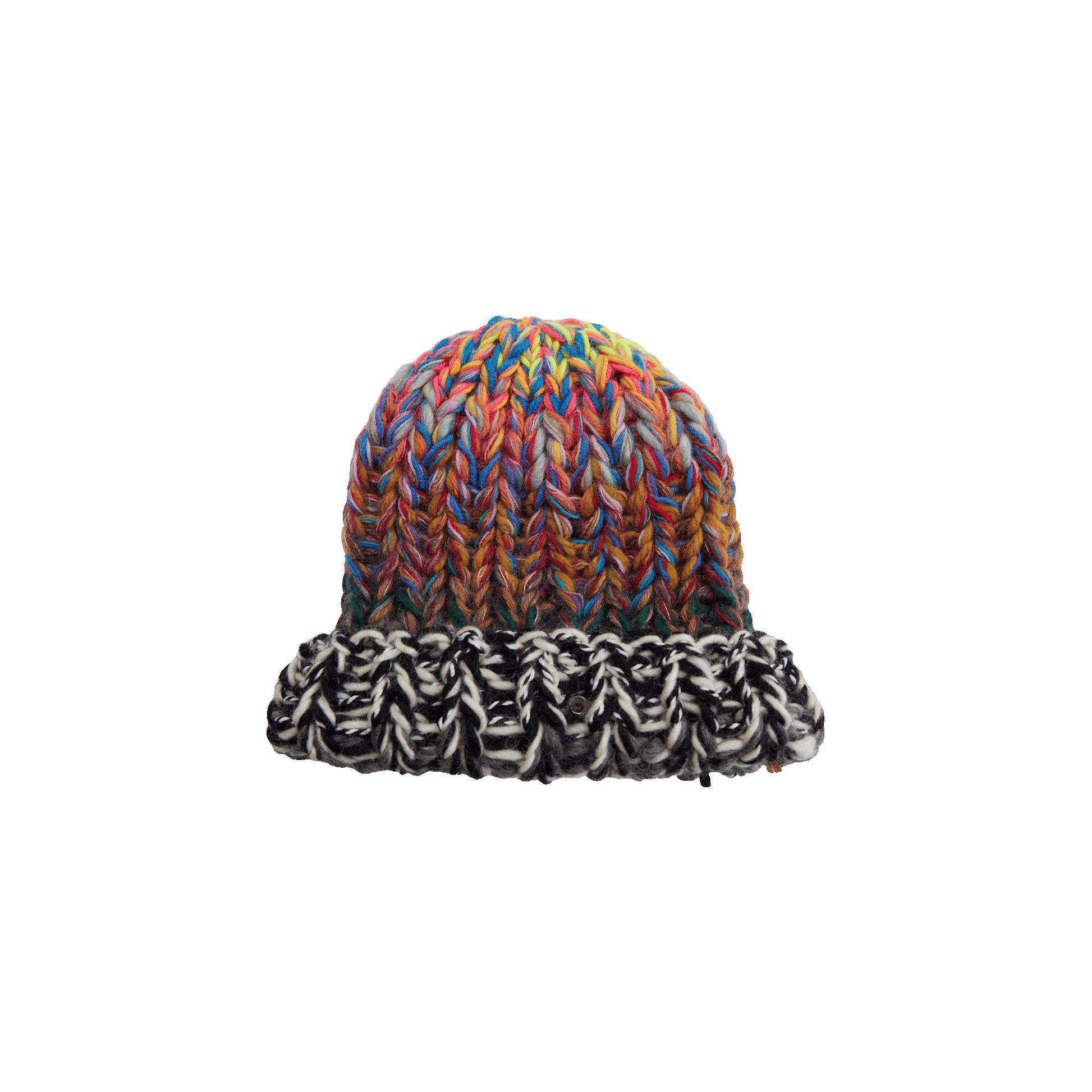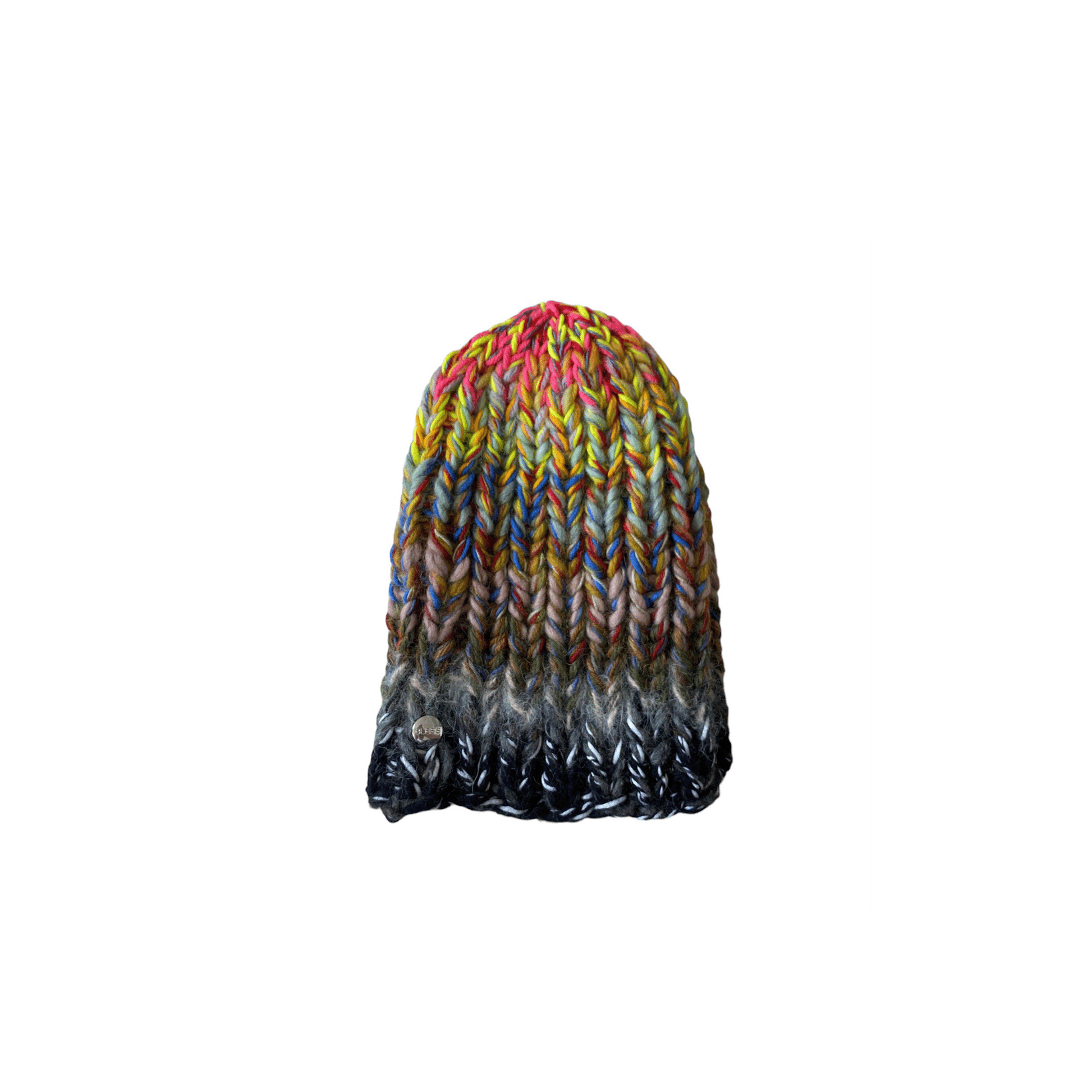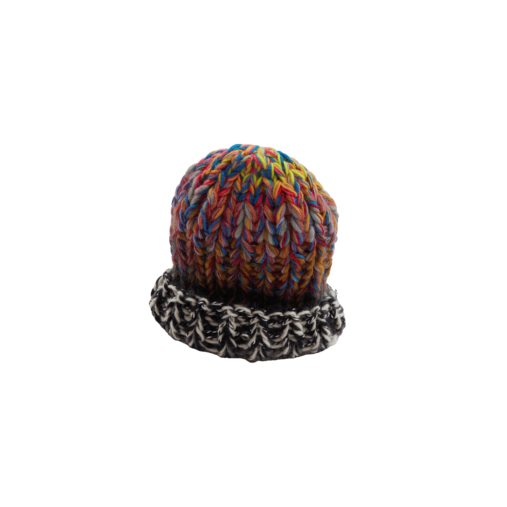 Chunky wool hat, hand knitted from multiple wool qualities in various colours. Can be worn open or rolled over on the hem