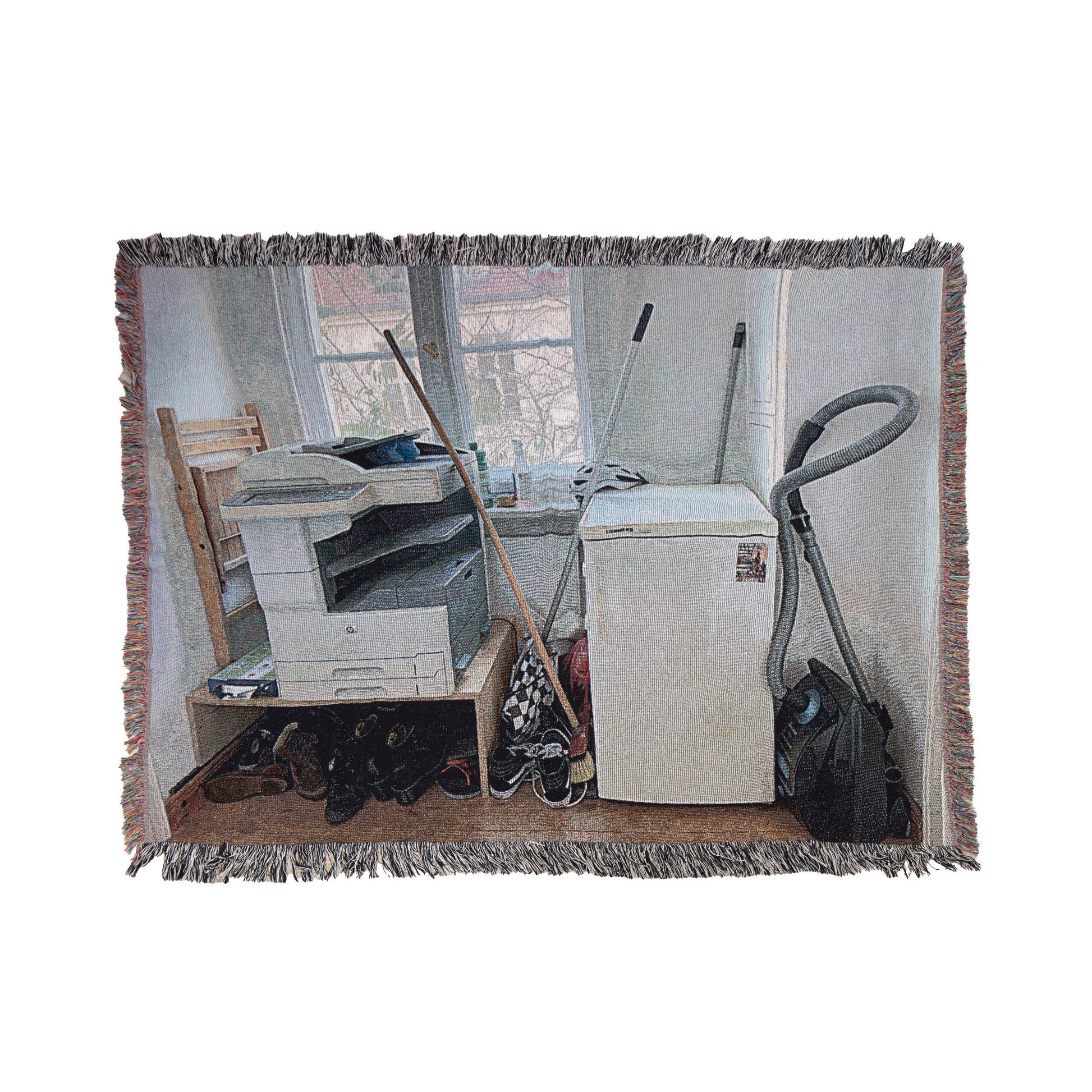 Woven blanket with fringed edge and BLESS engraved logo button.