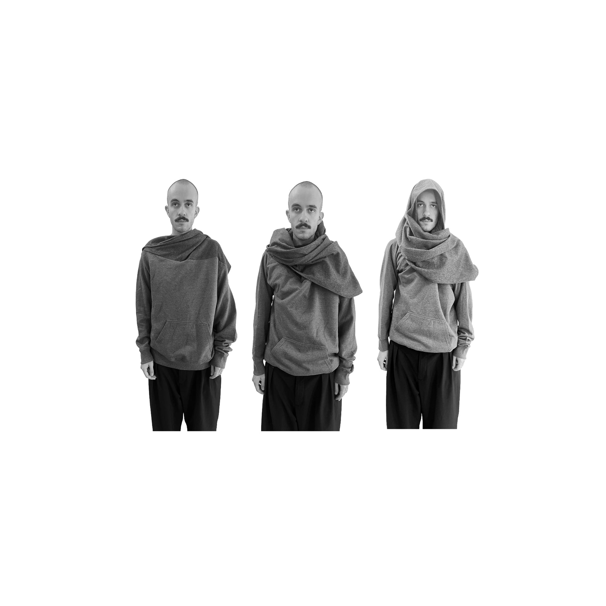 Jersey sweater with attached Cashmere scarf that shapes as loop to wear around neck. Wearable in many ways. Features pockets in front.