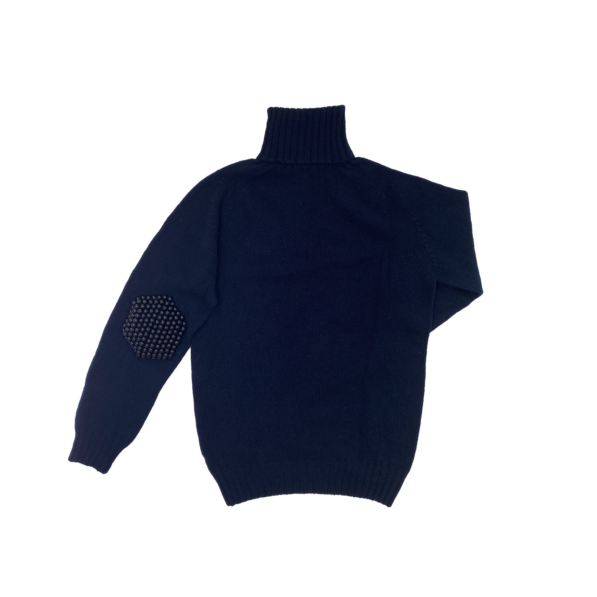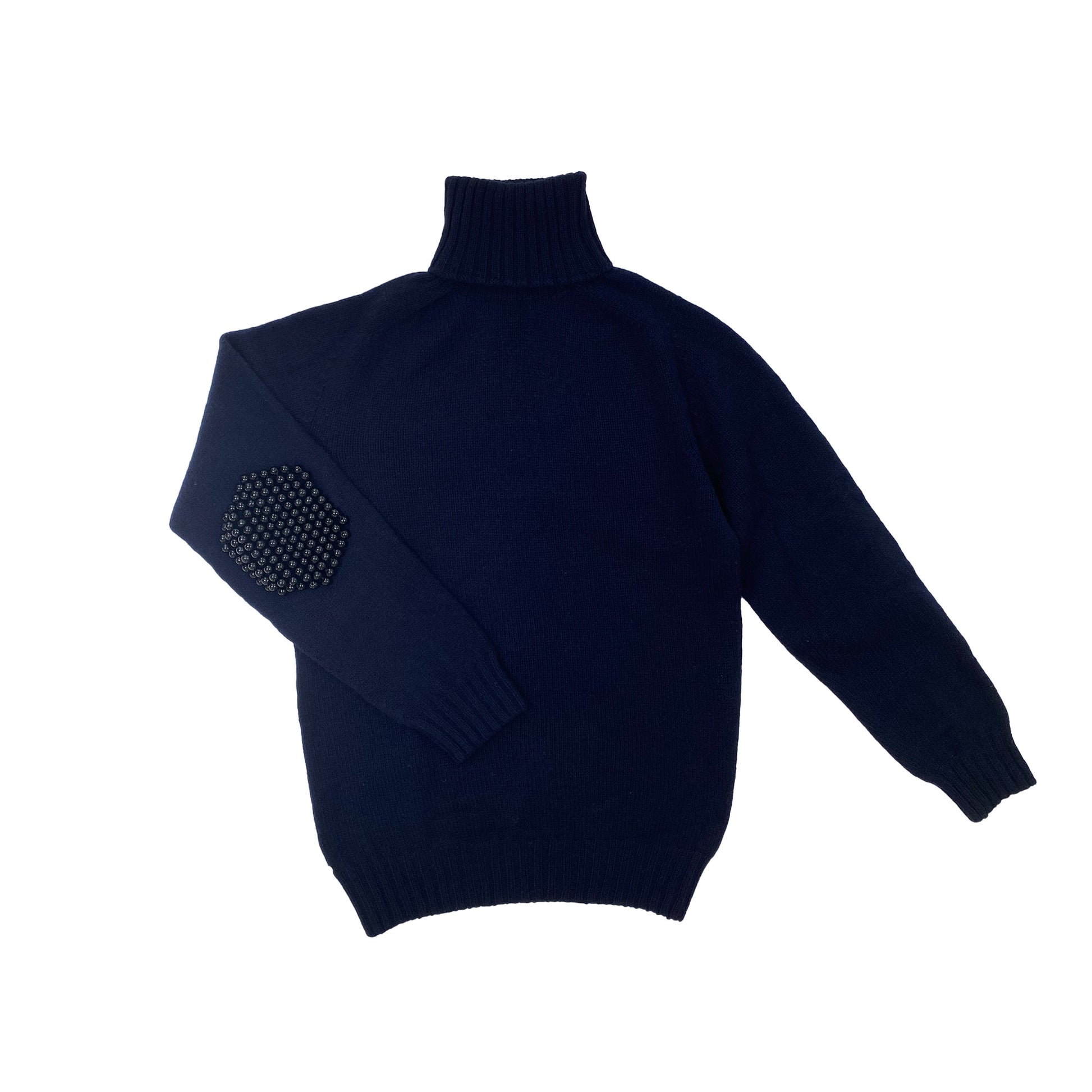 Turtleneck Sweater with wood beaded elbow patches.