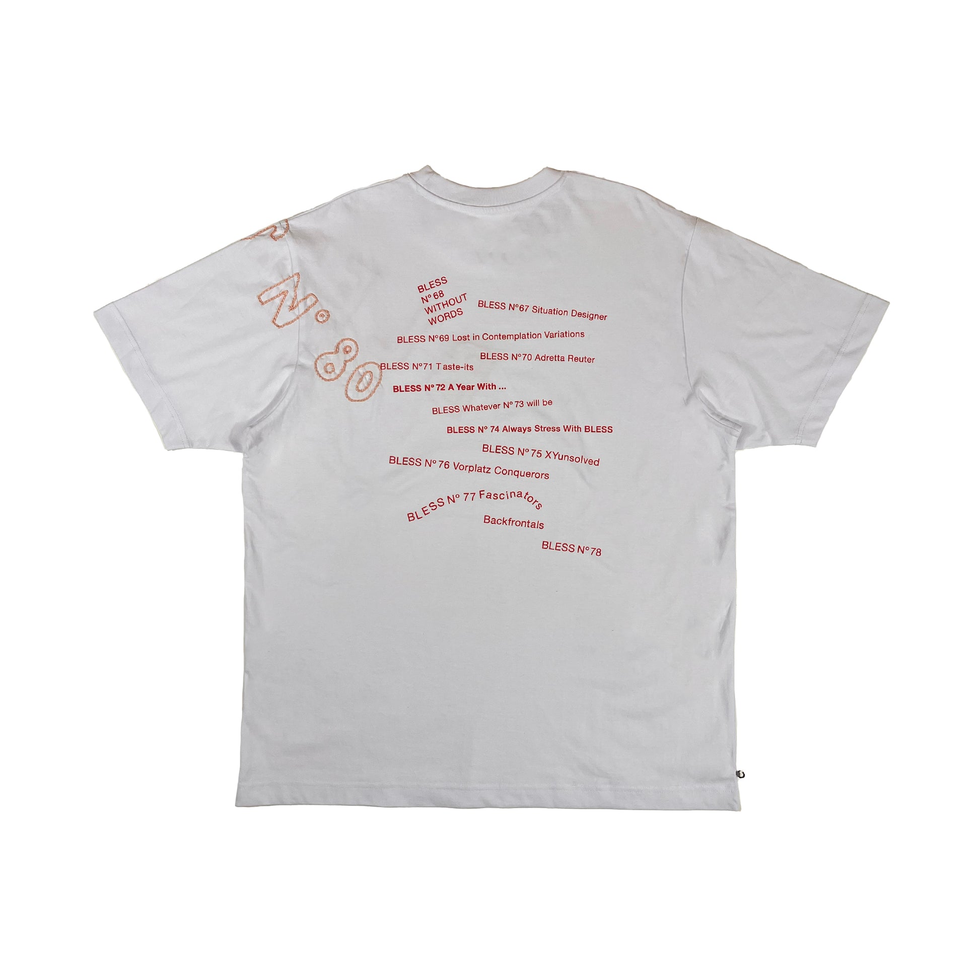 T-shirt with overprinted selected BLESS collection titles. Features colorful embroidery on front and back.