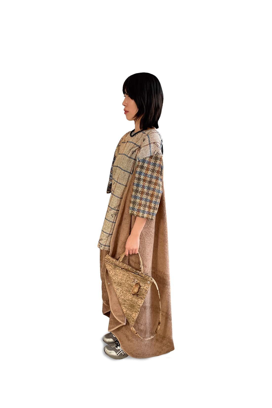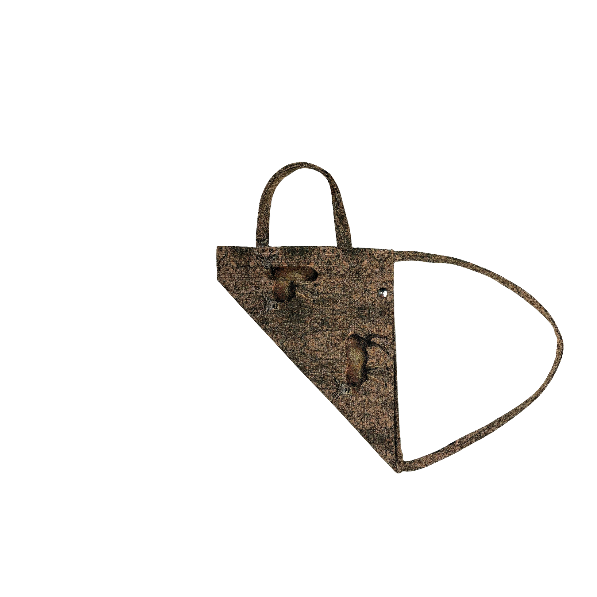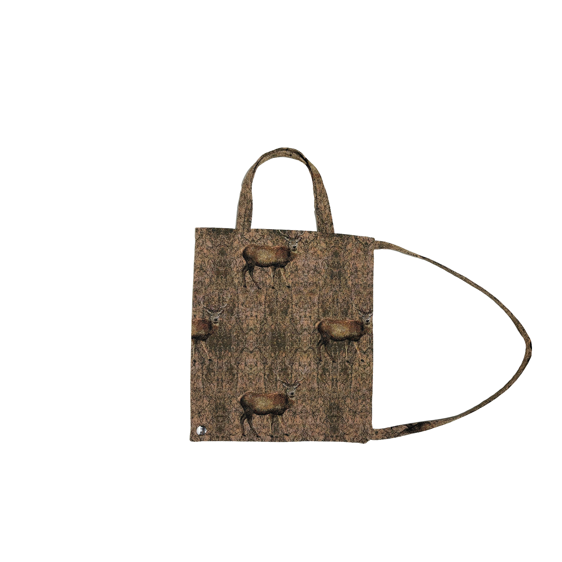 Foldable tote bag in woven gobelin fabric. Wearable in dfferent directions and ways with a snap button closure.