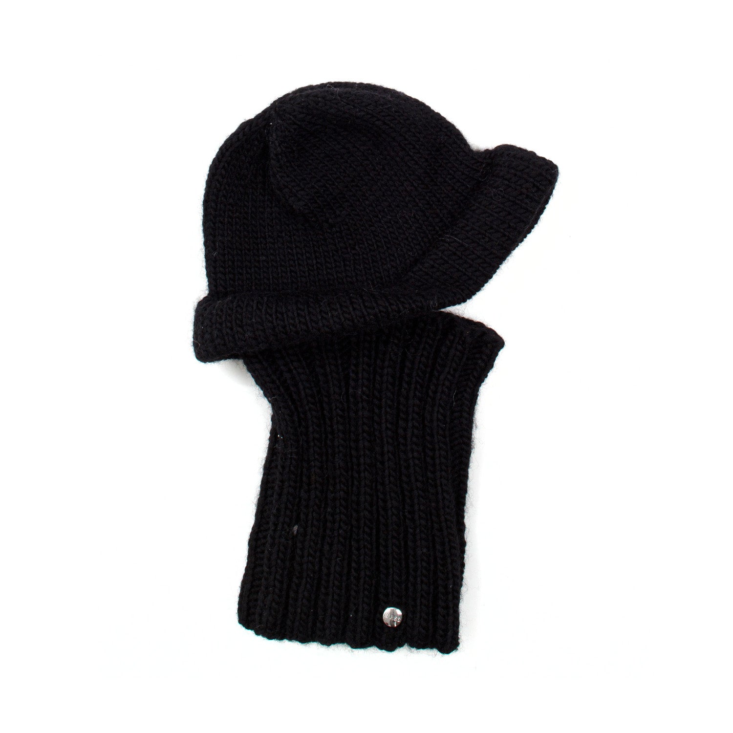 Knitted hat and neckwarmer attached in one piece with brim.