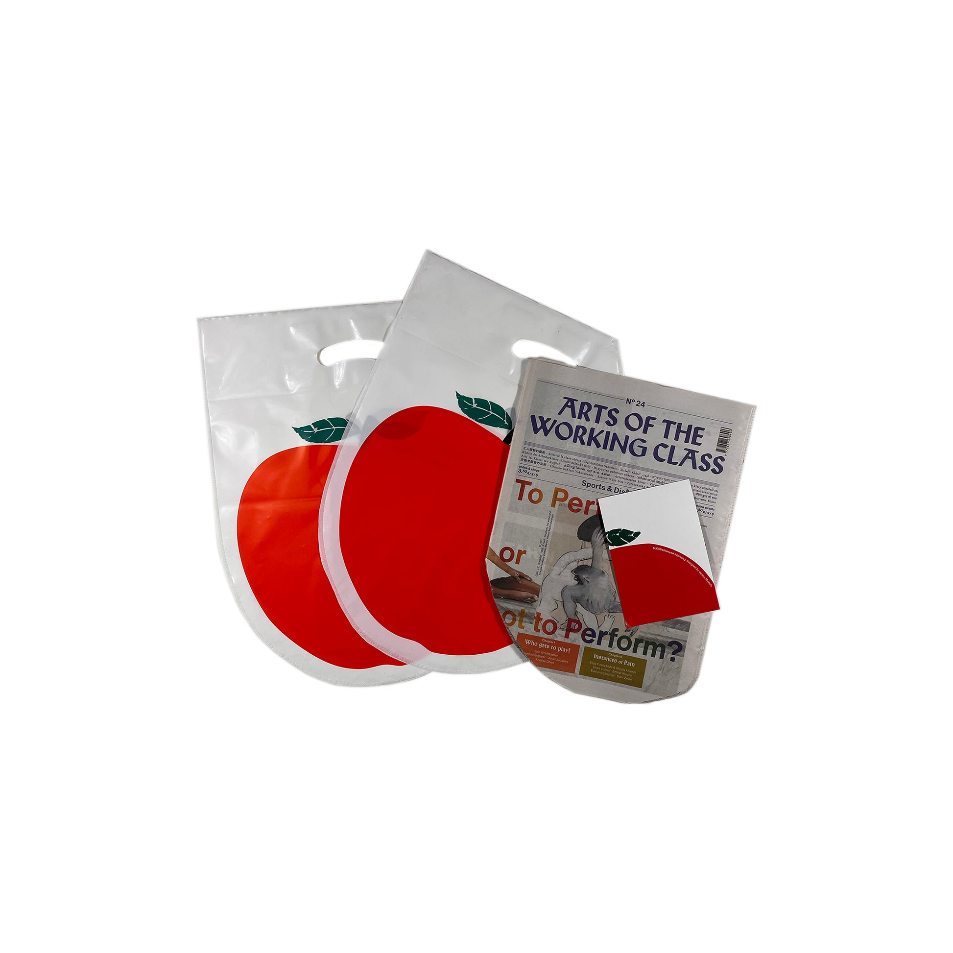 BLESSadvanced Applebag, designed by Verena Michels, is based on a preexisting plastic bag by De Appel contemporary arts institution, located in Amsterdam. The object that stems from about a decade ago, has been appropriated and turned into an accessory by transforming its original shape. The asymmetrical shape connects the organic print with the recognizable form of the iconic plastic bag itself. The welded curve follows the round form of the ripe, red apple, printed on each side, which was a logo initially designed by Will Holder. Following the ban of single-use plastic bags, Applebag elevates the meaning of an everyday object from the near past to a collectable item.